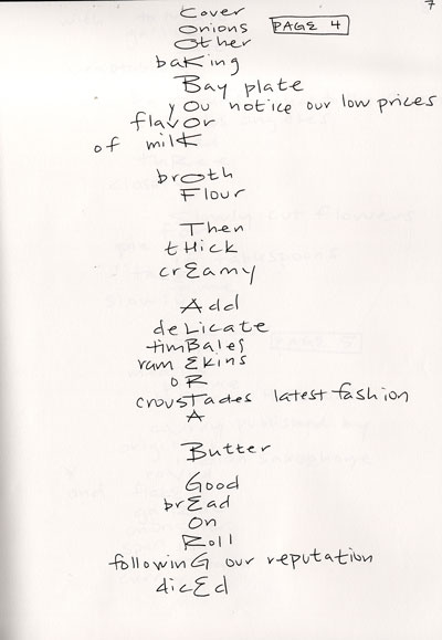 This project was a performance of John Cage's text-piece "Circus On", in which one transcribes a chosen text into sound, using sounds mentioned in the book, sounds of locations mentioned in the book, and "relevant musics". I used a Los Angeles neighborhood church cookbook from the 1920s that I found on archive.org as source material, thinking that a collection of cooking sounds, 1920s Los Angeles-related music, and recordings of downtown L.A., would work well, no matter how randomly put together.
